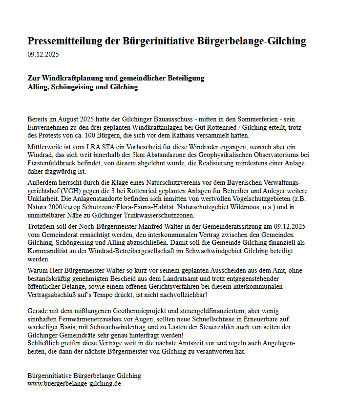 Das Thema "Interkommunale Verträge Windkraft" der Gemeinden Gilching, Alling und Schöngeising war am 09.12.2025 TOP 4 der Gemeinderatssitzung.