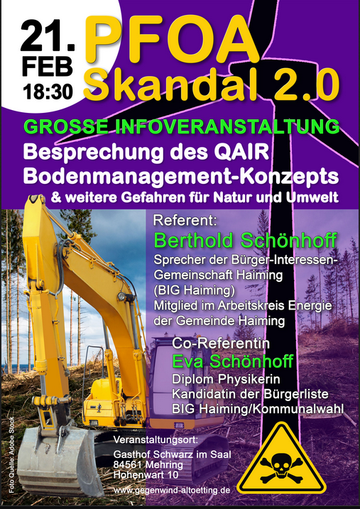 Alle Menschen, denen die Themen PFOA und Trinkwasserschutz im Landkreis Altötting wichtig sind und die sich für transparente Informationen und offene Diskussionen interessieren, sind herzlich eingeladen, an dieser Infoveranstaltung teilzunehmen. Insbesondere in Bezug auf den Bau der geplanten Windindustrieanlagen im Altöttinger Forst gibt es Gefahren und viele unbeantwortet Fragen.